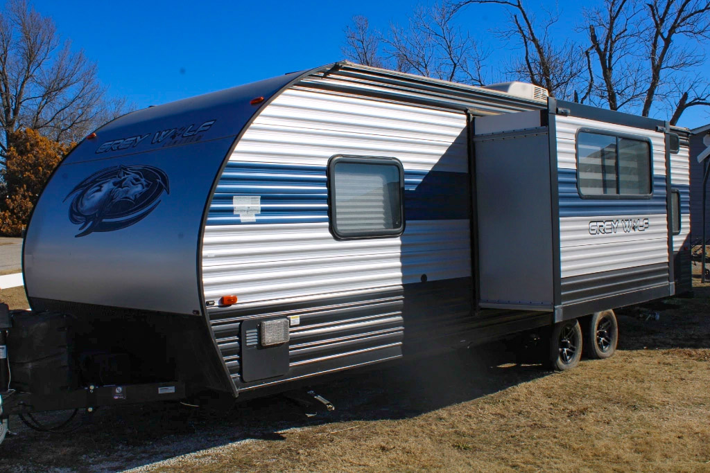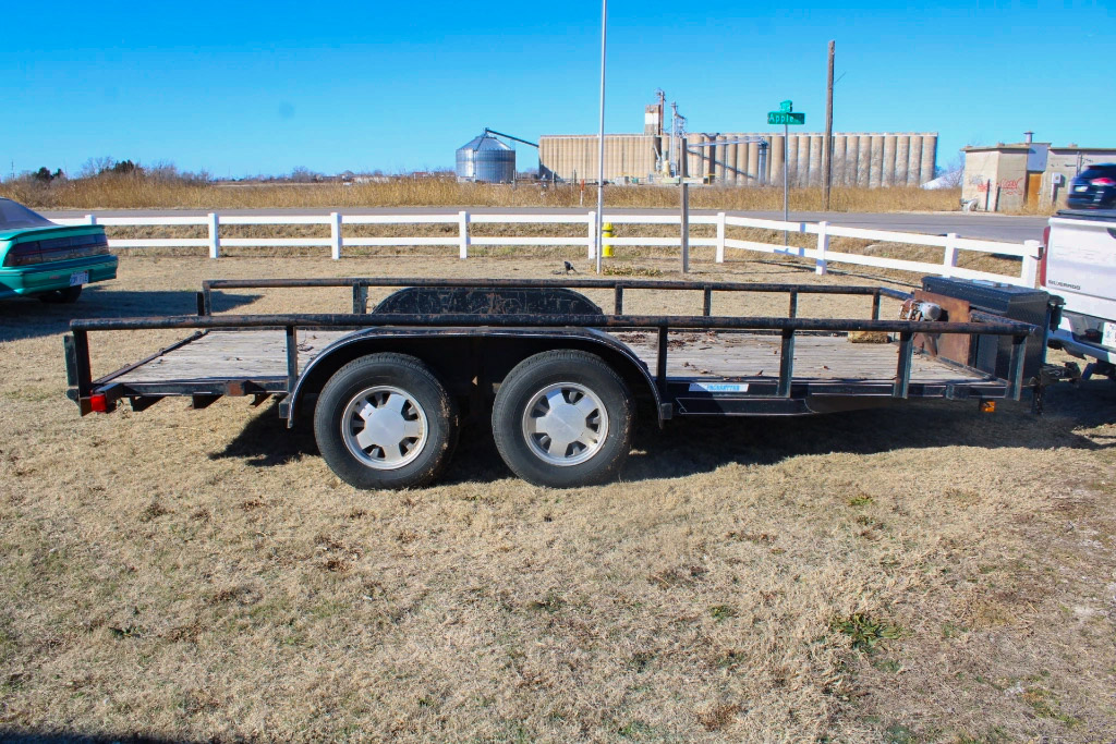 Tilt trailer; garden dump trailer; 2021 Forest River Grey Wolf 29’ Travel Trailer; 2021 Diamond C 16’ Car Trailer; several smaller trailers