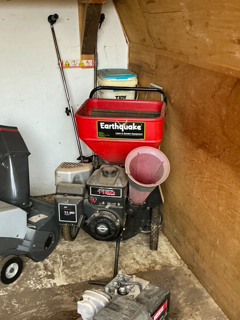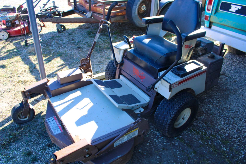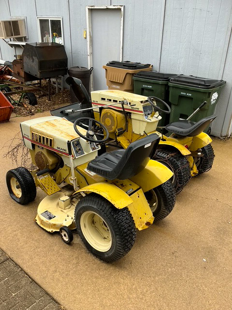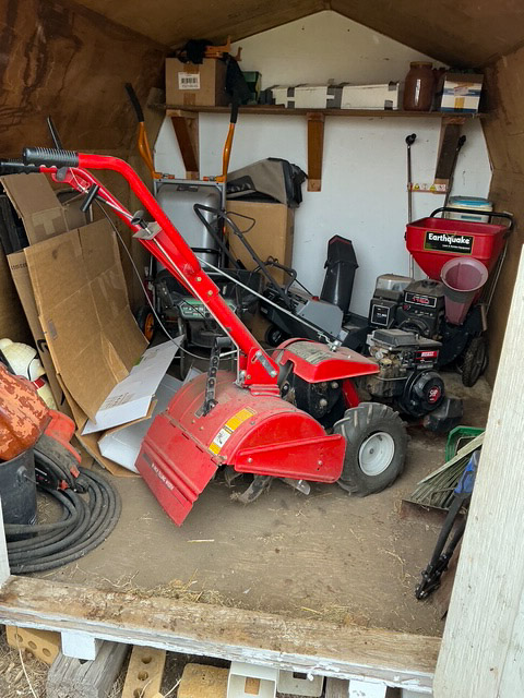 Folding chairs; 2- Sears rider mowers ST/10; Sears rider mower SS/16; wheel barrel; 24’ x 24’ Car port (to be moved); several push mowers; smoker; wagons; Green Mountain grill; old yard farm equipment; patio heater; fertilizer spreader; Huskee rear tine roto tiller 5HP; Earthquake wood chipper 11.5HP; flower pots; Craftsman snow blower; Grasshopper 614 ZTR lawn mower with Grasshopper bagger, many more items not listed